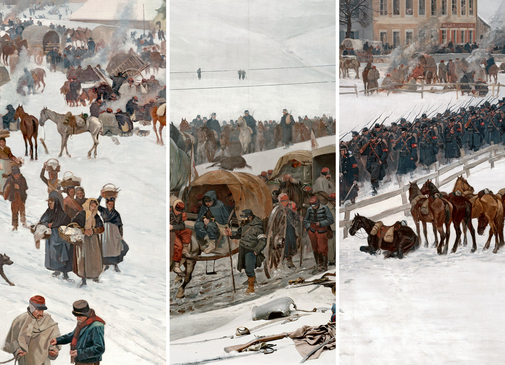 In der aktuellen Vertiefungsausstellung «Mein 1871. Spuren, Schicksale, Geschichten» erleben die Besuchenden die Geschehnisse der Internierung auf den Spuren der jungen Dorfbewohnerin Joséphine, des Soldatenpferdes Feuille und des Rotkreuzhelfers und späteren Malers des Rundbildes Edouard Castres hautnah mit. Sie legen an interaktiven Stationen selbst Hand an und bilden sich anhand originaler Erinnerungsstücke und des eindrücklichen Panoramafilms eine konkrete Vorstellung der Ereignisse.