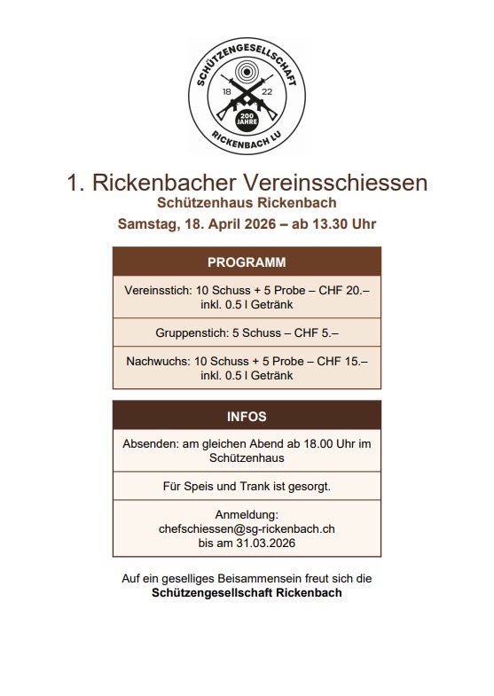 Alle Vereine von Rickenbach sind Herzlich Eingeladen zum 1.Vereinsschiessen. Von Gross bis Klein, es ist jeder Wilkommen. Natürlich gibt es auch eine Verpflegung in der Schützenstube. Bei interesse oder Fragen könnt ihr euch bei chefschiessen@sg-rickenbach melden.