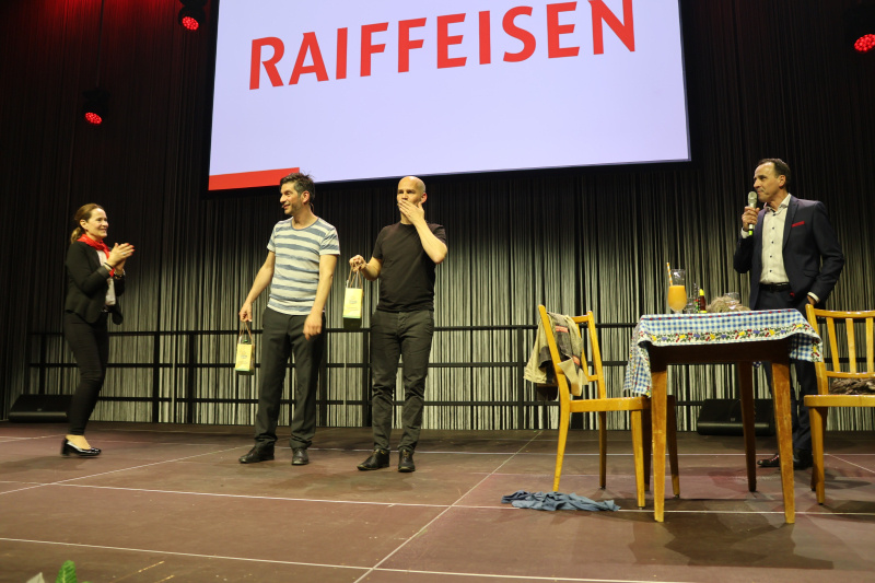 Dann war die Reihe an den auch vom Schweizer Fernsehen bekannten Komikern von Pasta del Amore. Christian Gysi und Bruno Maurer haben es in die Schweizer Comedy-Szene geschafft. Besonders ihre Rollen als Heinz und Werni haben sie bei Gross und Klein bekannt gemacht. Lustig-schräg etwa ihre Lebensweisheiten: «Leben ist wie ein Liegestuhl – wenn du zu viel drin liegst, klappt er zusammen.» Sie können jedoch auch subtiler, differenzierter. Sie liessen viel Wortwitz und Situationskomik aufblitzen, auch auf die Raiffeisen-GV bezogen. So sagten sie etwa: «Hier hat es Junge, mittlere Alter und auch «raiffe Eisen». Sie begeisterten die ganze Halle mit ihrem Auftritt, man konnte herzhaft lachen. Und sie taten alles in gewohnter Pasta del Amore-Manier auf unkonventionelle, ja anarchistische Weise. Immerhin so viel ist klar: Gehts langsam abwärts, zählt vor allem eines: Sink positiv! Auch eine kurze Zugabe schenkten sie den Genossenschaftern und spielten länger als vertraglich vereinbart. Sie sagten nach der Aufführung: «Wir haben uns an der Raiffeisen-GV sehr wohlgefühlt, es war ein dankbares Publikum, was an einer GV nicht selbstverständlich ist.»