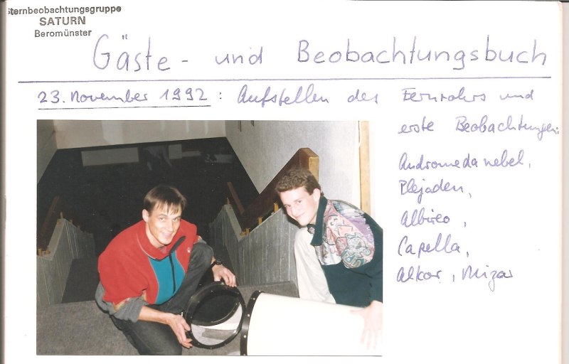 Und so kam im Frühling '92 der grosse Tag, an dem das in Einzelteile zerlegte Teleskop, welches bereits über ein Jahr im Luftschutzkeller der Kanti Beromünster zwischengelagert wurde, hätte an seinem neuen Bestimmungsort aufgebaut werden sollen. Die Rohre des Schiebedachs und alle Wände waren zur Montierung bereit. Wir hatten uns schon überlegt, wie wir die schweren Teile auf die Dachterrasse bringen könnten: aussen hinauf mit Seilen ziehen oder innen die Treppe hinauftragen... als ein aufgeregter Pater Fiedler, Rektor des Don Bosco, auf uns zurannte: «Bitte nichts montieren, die Dachterrasse muss saniert werden, sie ist an mehreren Stellen undicht!» Eine grosse Enttäuschung machte sich bei mir breit, denn das hiess, dass das Projekt nun sicher für ein halbes Jahr wieder aufs Eis gelegt wurde. Das gab mir allerdings nochmals mehrere Monate Zeit, weiter Geld zu sammeln, denn das Sammelziel war bei weitem noch nicht erreicht. Am 23. November 1992 war es dann endlich soweit: ein Schüler meiner Klasse, der neue Sternwartenleiter von Sursee und ich stellten zusammen das Teleskop auf, kurz nachdem die Schlosserei Müller das Häuschen montiert und die Schiene am Geländer befestigt hatte (Bild 5).