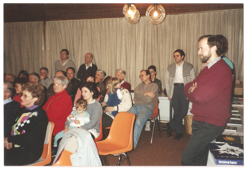 Dann kam der 11. Dezember 1992. Das Bläsersextett der Kantonsschule (Bild 6) machte in einer kalten Nacht den Anfang der Eröffnungsfeier, bevor Pater Stiegler das Teleskop einsegnete und es seiner alten Bestimmung am neuen Ort übergab. Rund 50 Personen aus nah und fern hatten sich dazu eingefunden, die allesamt froh waren, ins warme Innere dislozieren zu dürfen für den zweiten Teil (Bild 7). Dort bedankten sich Gemeindepräsident und Rektor der Kantonsschule, Dr. Felici Curschellas, sowie Gemeindeschreiber und Leiter der Volkshochschule Anton Suter bei der noch jungen Sternbeobachtungsgruppe Saturn für ihre Initiative. Sie brachten ihrer Hoffnung Ausdruck, dass die neue Sternwarte vielen Menschen den Himmel auf die Erde bringen würde.