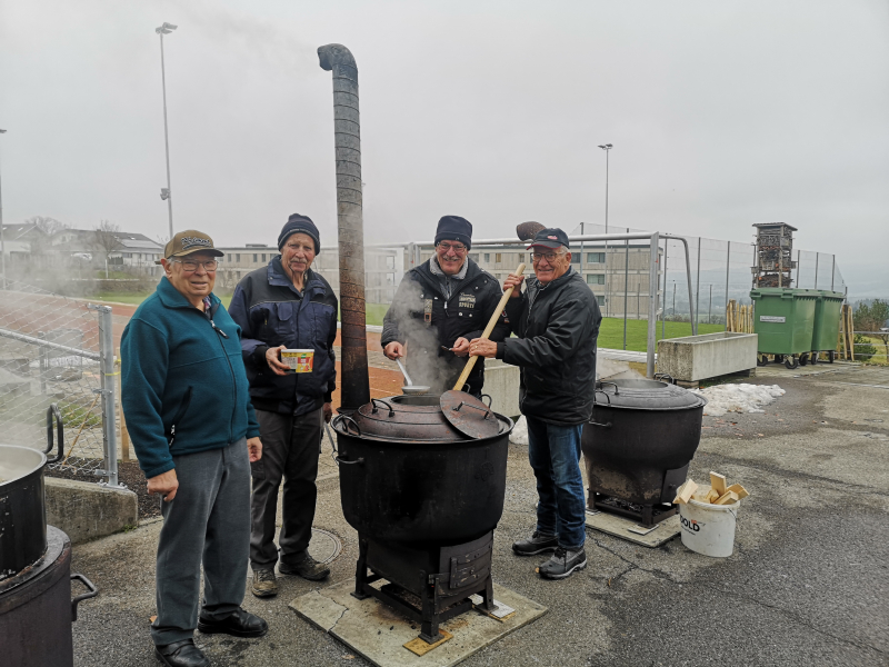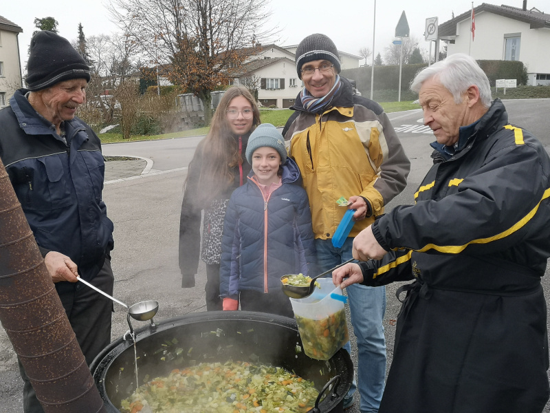 Die 43. Auflage des Suppentages war ein voller Erfolg. Hausfrauen und Hausmänner wissen die fertig zubereitete Mahlzeit sehr zu schätzen. Dank trockenem kaltem Wetter am Samstagmorgen war die Nachfrage nach heisser Gemüsesuppe mit Militärspatz besonders gross. Bis die Suppe in den drei alten holzbefeuerten Kessi brodelte, war einiges zu erledigen. Chefkoch Rolf und sein Team mit Theo, Franz, Sepp und Jörg leisteten Schwerarbeit – im Besonderen die Reinigung der schweren Eisenkessi. Und am Vorabend rüsteten die 30 aktiven Männerriegler in geselliger Art das Suppengemüse in der Grossküche des Zentrums «inPuls». Gleichzeitig durften die fünf Jubilare Elmar, Hans, Bruno, Marc und Jörg, alle mit runden Geburtstagen, die Glückwünsche entgegennehmen.