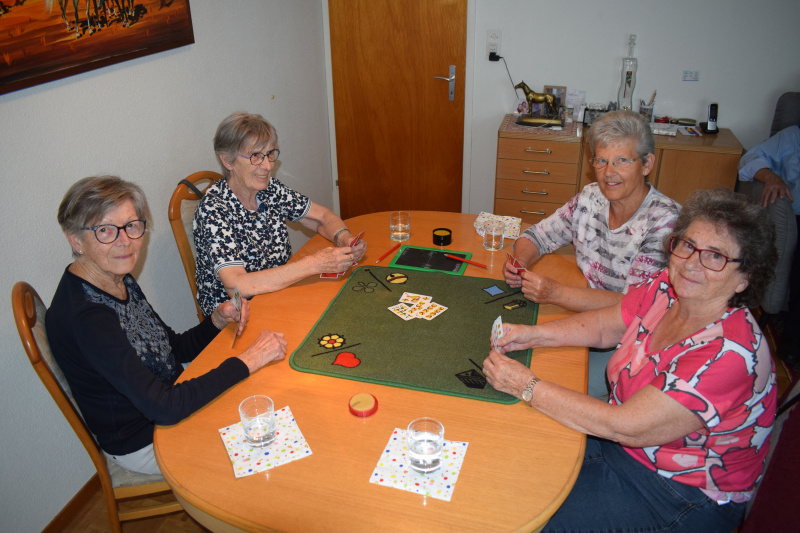 (Eins.) «Nach der Abendmesse entstand die Idee, eine Jassgruppe zu gründen», erinnern sich die Frauen. Stöck – Wys – Stich, 4500 Punkte sind zu erreichen: die Regeln sind klar und seit 50 Jahren dieselben. Anfänglich wurde abends gejasst, während ihre Männer zu Hause den Hütedienst übernommen hatten. «Es ist auch schon 2.00 Uhr geworden», erinnert sich Trudi zurück. Heute aber spielen sie am Nachmittag und treffen sich zu Kaffee und Kuchen. «Schliesslich müssen wir uns bei einem ganzen Jassnachmittag auch ab und zu stärken!», erzählt Blanca Bucher und schmunzelt.