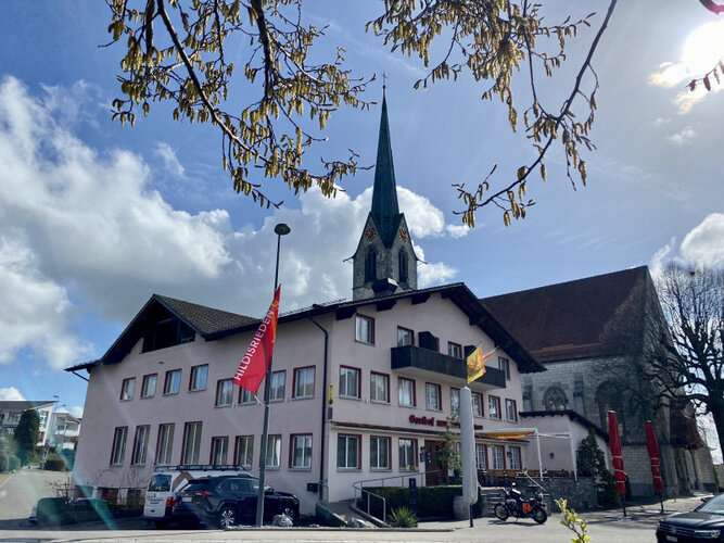 Hildisrieden mit seiner Kirche im prächtigen Sonnen- und Frühlingsglanz.