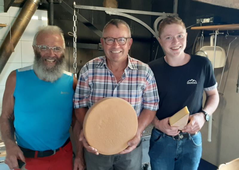 Bruno Häfliger zeigt eigenproduzierten Alpkäse, begleitet von Franz Wey (Rickenbach) und Landwirt-Lehrling Jonas Lang (Schlierbach).
