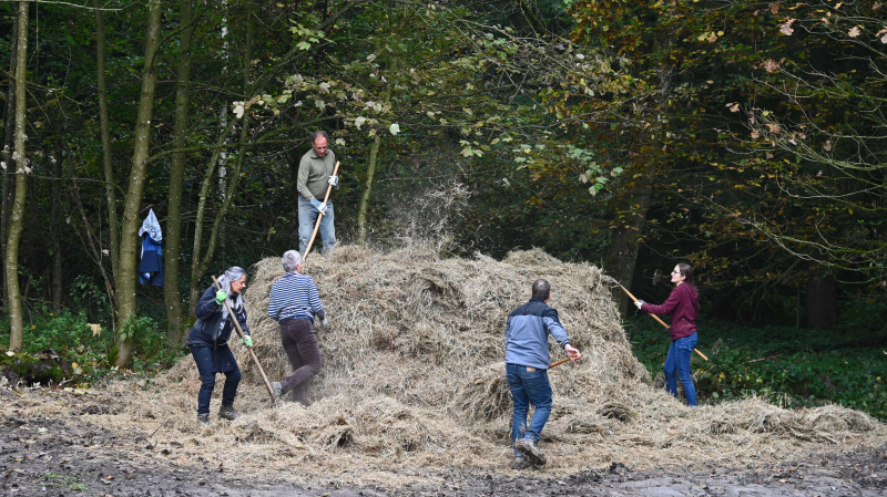 Da es sich um die Wiederherstellung eines bestehenden Stillgewässers handelte, ging alles sehr rasch. Der Bagger der Firma Risi ist Anfang Oktober aufgefahren, um den Weiher wieder in Form zu bringen. Dabei wurde das Gewässer wieder geöffnet und darum herum grosszügig Gehölz entfernt. Mit der Ausbildung von Flachwasserzonen gibt es nun Bereiche, wo sich das Wasser schneller erwärmt. Etwas, das Amphibien, wie etwa Wasserfrosch, Berg- und Fadenmolch besonders lieben. Mitte Oktober packten die Mitglieder des Vereins NaturMichelsamt selbst zu, um Kleinstrukturen für verschiedene Tierarten zu realisieren. Sie platzierten Nistmöglichkeiten für höhlenbrütende Vögel und Quartiere für Fledermäuse. Entlang dem Waldrand bauten sie zwei Wieselburgen, die dem geschickten Mäusejäger, trockene und vor Feinden geschützte Jugendstuben bieten. Sie schichteten einen Heuhaufen mit unbelastetem Schnittgut, wo die Ringelnatter optimale Voraussetzungen vorfindet, um ab dem kommenden Mai ihre Eier abzulegen. Zusätzlich wird der Verein im November ortstypische Sträucher – u.a. Schwarzdorn, Kornelkirsche, Pfaffenhütchen und Wildrosen pflanzen.