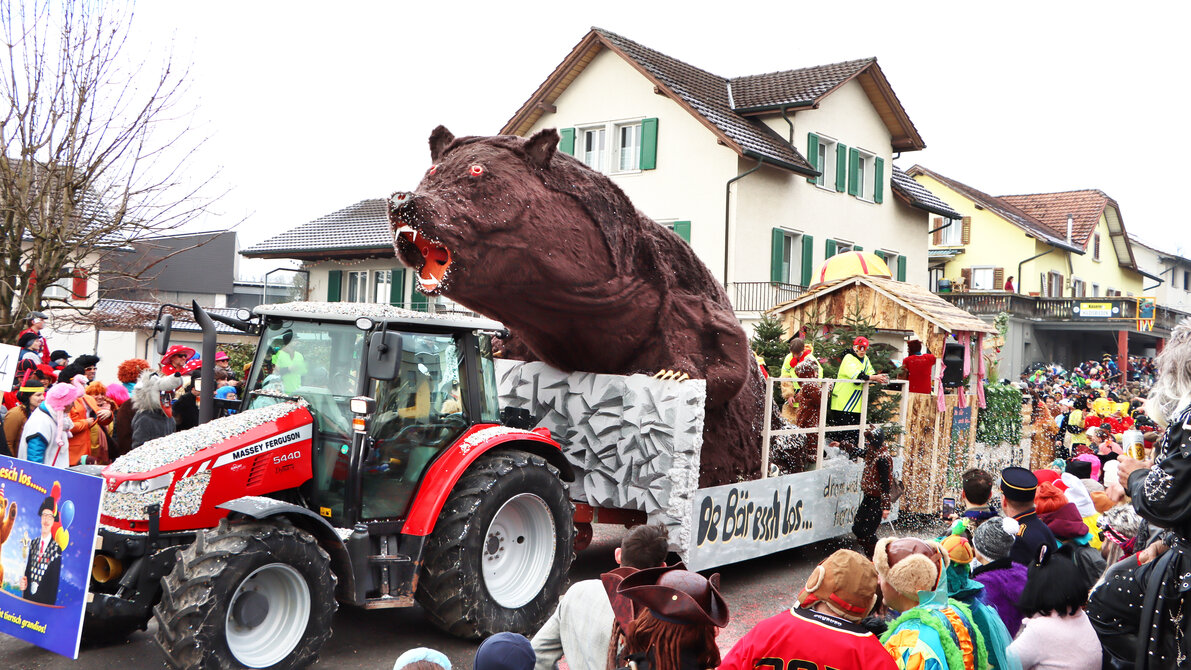 Unter den Fittichen von Wagenbauchef David Aecherli wurde in der Vorfasnacht unermüdlich gebaut. Das Resultat war ein «bärenstarker» Wagen mit «Tschäppi-Bar» und Konfetti speiender Bärenschnauze.