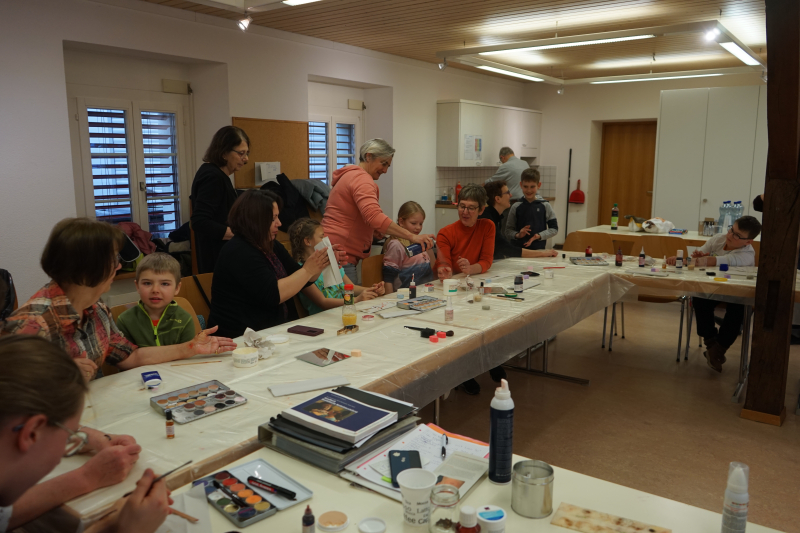 Grossmami mit Grosskind, Mami mit Kind oder Tante mit Nichte trafen sich zu einer spannenden Übung im Probelokal der Samariter Rickenbach. Die gestalteten Verletzungsmuster reichten vom Zeckenbiss über die Schnittwunde bis hin zur Schürfung. Es wurde ausprobiert, modelliert, gemalt und geklebt. Nach einer kleinen Znünipause ging es weiter und man getraute sich an einen Bluterguss mitten auf der Stirn oder an den ganzen Arm voller Schürfwunden.