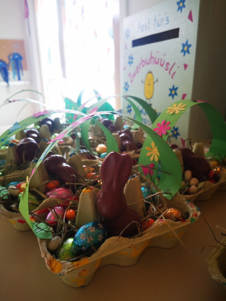 Auch in der Raumspielgruppe hat der Hase einen Besuch abgestattet und die Osternestli grosszügig mit Schoggi- und Zuckereier befüllt.