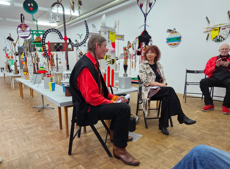 Der Raum wirkt hell, die Dinge darin bunt, verwirrlich, aneckend und verspielt. Der Künstler und die Anthropologin führen ein Gespräch, rund 20 Personen lauschen gespannt.