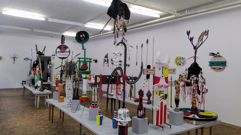 Im zweiten Raum überwältigt uns die Fülle von Matthias Estermanns Schaffenskraft: Rund hundert Augen von Masken und Puppen folgen uns auf unserem Rundgang. Erst auf denzweiten Blick erkennen wir, woraus sie zusammengesetzt sind. Dinge, die langsam von dieser Welt und auch aus dem Michelsamt verschwinden: Waschbretter, Plakengewehre, Markbeine, Sicheln, Dachbalken, Spinnräder oder schicke Rollschuhe. So ist die Reise durch die Baselstrasse auch eine Reise in die Vergangenheit. Und zu den indigenen Kulturen Nordamerikas.