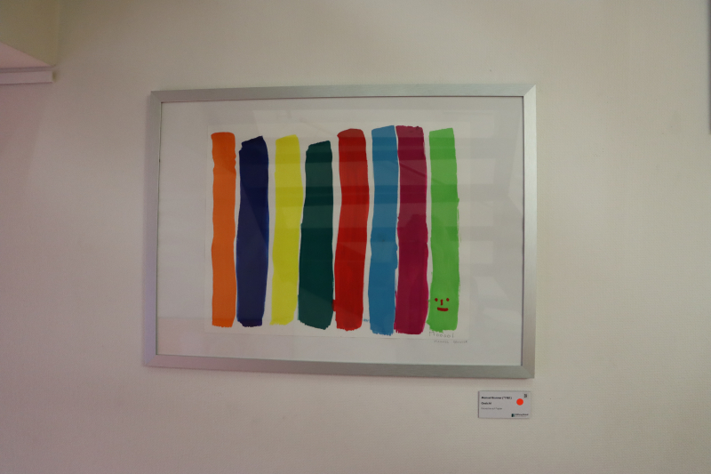 Weiter oben ein Bild mit sechs farbigen Strichen. Einfach Farben, man spürt förmlich den Genuss, mit dem sie aufgetragen worden sind, der Blick folgt der Farbenreihe, an deren Ende schelmisch ein winziges, lachendes Gesicht hervorblickt. Ha, ertappt fühlt man sich da!