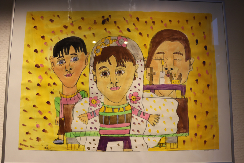 Andere Bilder zeugen von einer unglaublichen Tiefgründigkeit: Die Familie, die um das sterbende Kind trauert. Liebevolle, fast zärtlich gemalte Gesichter. Augen, die sprechen. Daneben in ebenso bunter und kecker Malweise, die Mona Lisa. Man kann nicht unberührt daran vorbeigehen.