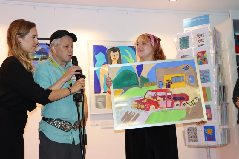 Berührend, herzlich und erheiternd waren darauf die Kurzinterviews mit drei Kunstschaffenden, die über ihre Bilder erzählten. Nicole Fontana sprach in einer Selbstverständlichkeit über «die Beerdigung unseres Kindes», die sie gemalt hatte, und dass das Sterben und das Leben zusammengehörten, aber sie male eben lieber das Leben. Martin von Dach erzählte aufgeregt von seiner «Zeitmaschine» und Daniel Meier, mit «Chäppi» und schillerndem Paillettengurt, sprach ganz cool über Elvis, den er verehrt und schön farbig gemalt hatte – aber eigentlich nur sein Auto, denn Elvis war gerade nicht da.