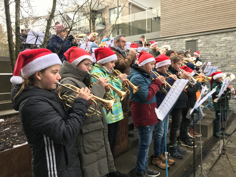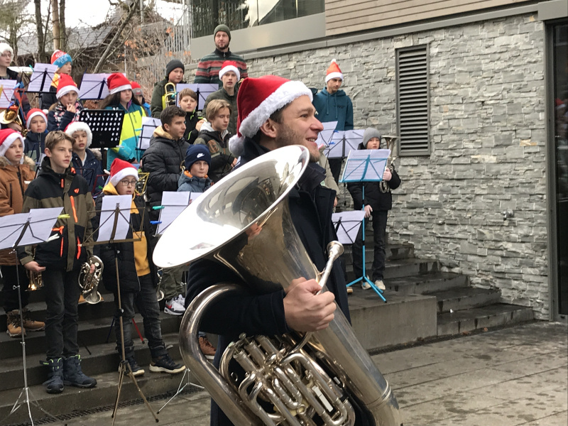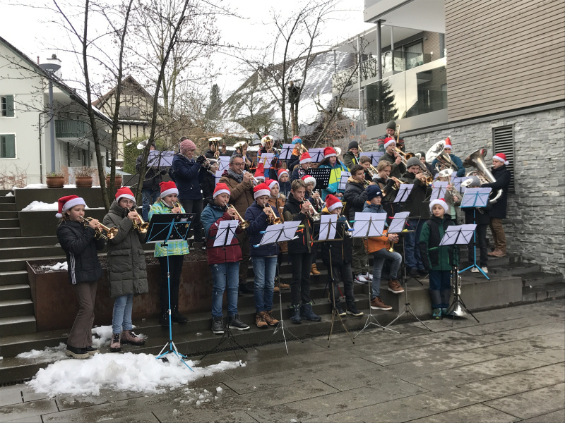 «Es ist für viele die erste Konzerterfahrung!», sagt Musikschullehrer Benjamin Wey, der das sympathische Freiluftkonzert mit dem originellen Titel «Blechweihnachten» kurzerhand ins Leben rief. Weihnachtslieder auf den Notenständer geklemmt und rote Mütze aufgesetzt – schon stand die Formation junger Musikschülerinnen und Musikschüler perfekt da. Mit «Kling Glöcklein klingelingeling» oder «Lasst uns froh und munter sein» vermochten sie der Zuschauerschar auch bei trübem Regenwetter ein wenig frohe Weihnachtsstimmung zu vermitteln. Alle hatten grosse Freude an der Darbietung.