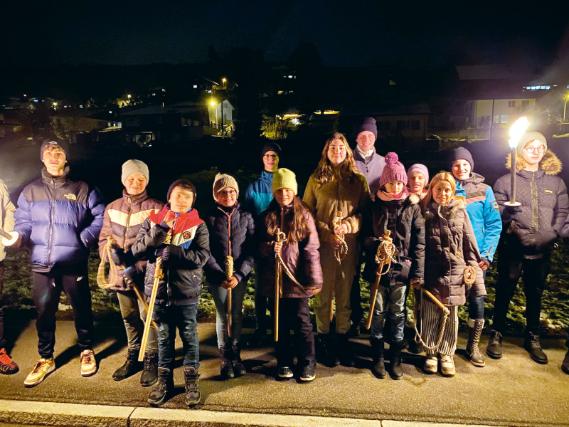 Die 3. bis 6. Klasse war dieses Jahr auch sehr aktiv. Sie sind ebenfalls dabei, wenn der Samichlaus das Dorf besucht. Eine kleine Gruppe feilte nämlich unter der Leitung von Gianna Dommen während ihrer Freizeit an der «Geisslechlöpfe»-Technik. Dabei wurden sie von Vater Raphael und einigen Pfeffiker Sekundarschüler:innen unterstützt. Ausserdem stimmten die Schulgöttis und Schulgotten der 3.-6. Klasse die Patenkinder der Basisstufe mit einer Geschichte auf den Samichlauseinzug ein. Sie übten sich im Vorlesen und gestalteten dazu passende Bilder. Dann war der langersehnte Tag endlich da. Am Morgen durften die Basisstufenkinder die Kerzen ihrer Laternen zum ersten Mal anzünden. Schliesslich ging es dann am Abend richtig los! In Begleitung der Rickenbacher Trychlergruppe setzte sich der Umzug in Bewegung. Am Dorfrand trafen die Schüler dann tatsächlich auf den Samichlaus und gemeinsam mit seinen Schmutzlis wurde er bis vor die Dorfkirche begleitet. Voller Freude konnten nun die Lieder und die Versli vorgetragen werden. Natürlich stellten auch die «Geisslechlöpfer» ihr Können unter Beweis. Mit dem Besuch des Chlausmarktes auf dem Schulhausplatz ging ein für die Kinder unvergesslicher Tag zu Ende.