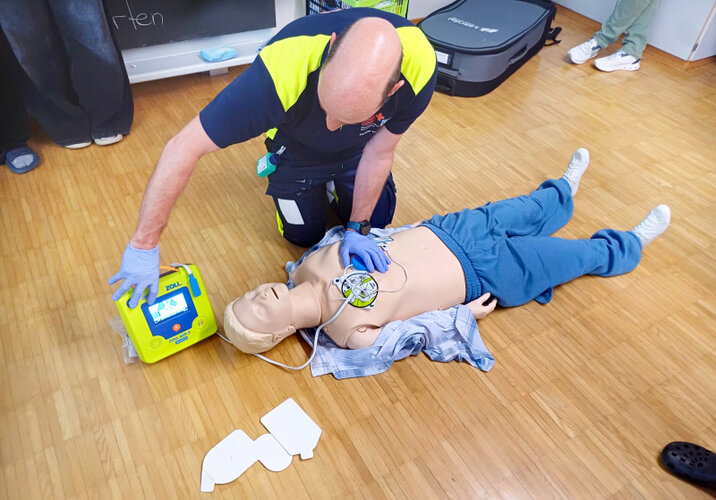 Man bringe die Patientin in die stabile Seitenlage. Aber wie? Geübt wurde im Schulareal Kubus.Per Quiz zu mehr WissenNach vielen interessanten Informationen konnten die Schülerinnen und Schüler ihr neu dazu gewonnenes Wissen auf die Probe stellen, denn Martin Steiger hatte zu dem Crash-Kurs noch ein Kahoot-Quiz vorbereitet, und wer gewinnt bekommt eine Rettungsdecke – aber was ist das überhaupt? Eine Rettungsdecke…