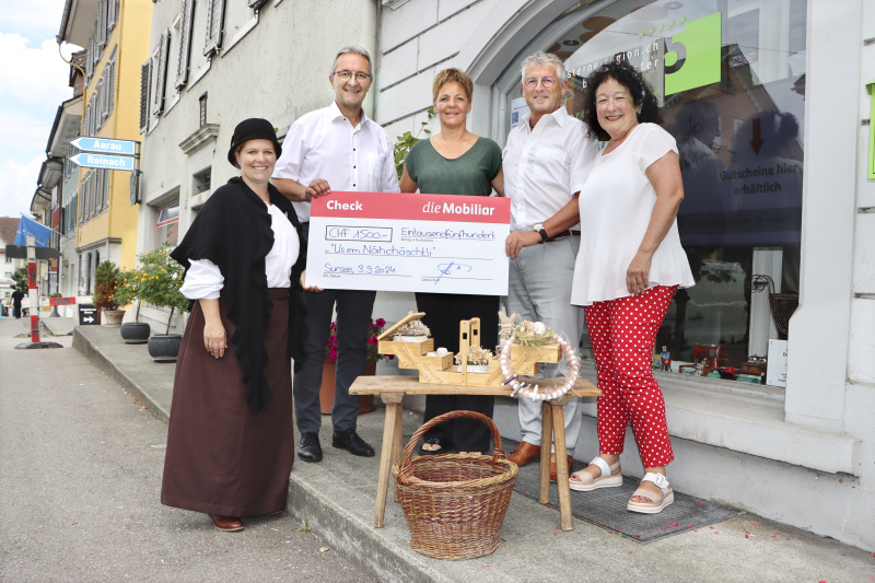 Am vergangenen Dienstag besuchten Herbert Heini und Markus Jost das Büro des Ortsmarketings mit einem Check, der im Nähkästchen von Schauspielerin Martina Beer definitiv keinen Platz hatte, aber umso mehr die Ortsmarketing-Präsidentin Manuela Felix, Geschäftsstellenleiterin Rebekka Schüpfer sowie alle an der Produktion Beteiligten erfreute. «Der Betrag wird zweckgebunden eingesetzt und dem Projekt gutgeschrieben», sagte Rebekka Schüpfer strahlend und verrät somit, dass die theatralisch inszenierten Frauengeschichten, von drei Schauspielerinnen an verschiedenen Orten in Beromünster vorgetragen, weitergeführt werden. Wohin, sei noch unklar, aber Manuela Felix bestätigt: «Es wird weitergenäht!» So darf man gespannt sein, an welchem Faden die Geschichten des beliebten «Näihchäschtlis», auch dank dem Zustupf der Mobiliar, in Zukunft weitergesponnen werden.