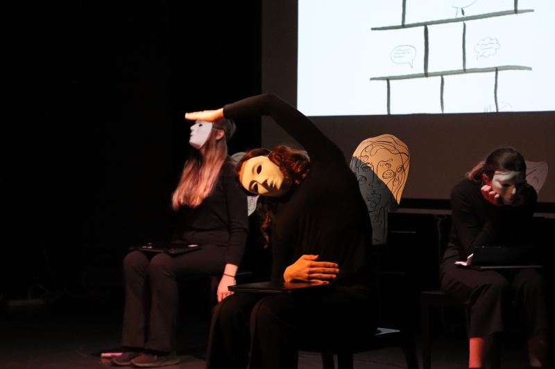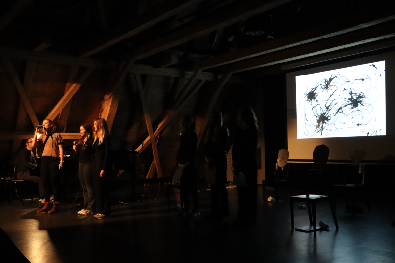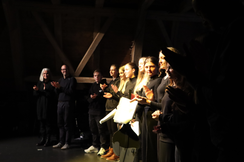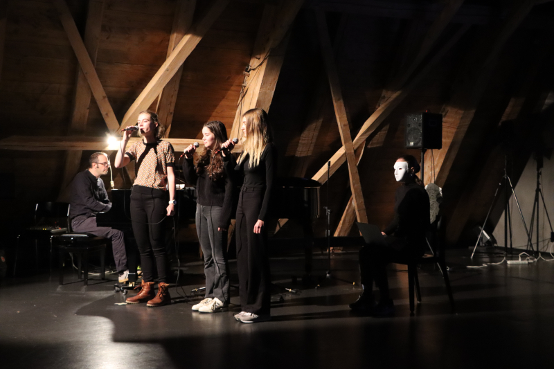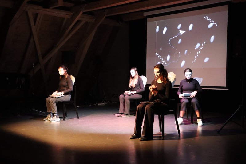 Die Performance wirkte kontrastreich in Dunkel und Hell, und der Gesang brachte warme und nuancierte Klänge in den Raum. Die Darbietung war optisch und akustisch ein Erlebnis. Vier Protagonistinnen, schwarz gekleidet mit weissen Masken, sitzen auf Stühlen, fungieren an Laptops. Kurze Sprechpassagen und sich wiederholende Bewegungsabläufe ziehen wirkungsvoll in den Bann. In Projektion im Hintergrund ein transparentes Wechselspiel aus Formen und Bildern in Schwarz-Weiss. Es zeigt die Situation einer Gruppe, aus der ein einzelnes Mitglied ausgeschlossen wird, welches sich folglich aus dem Hintergrund heraus Aufmerksamkeit verschafft mit anonymer Belästigung und Drohung via Social Media. Die Verunsicherung, die das bewirkt, wird eindrücklich dargestellt wie auch die Ansätze zur Lösung, die schliesslich nur im Verständnis und in der Vergebung gefunden werden kann.