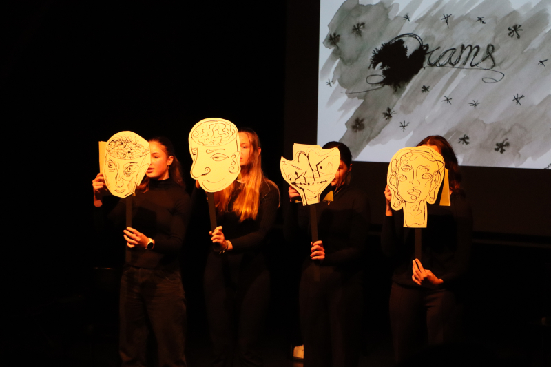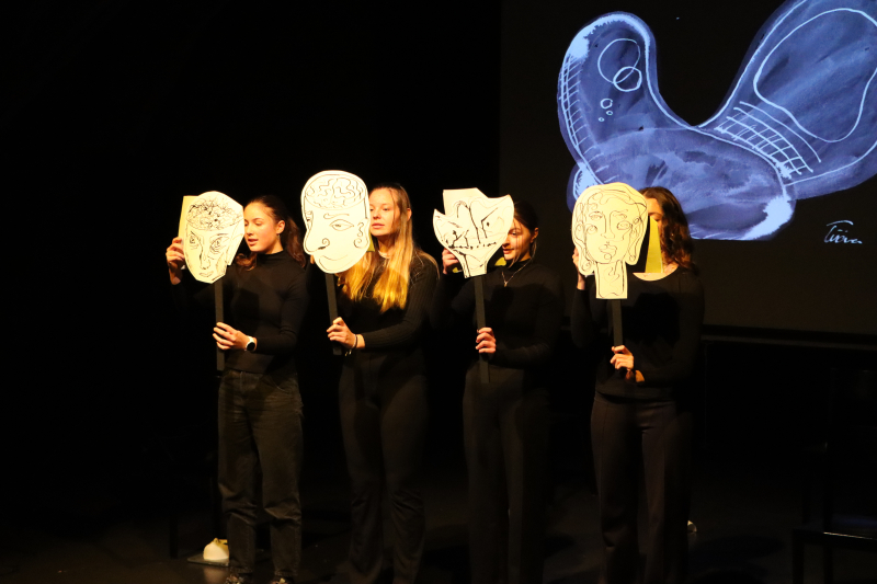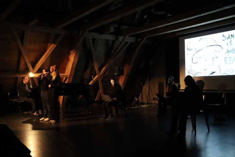 Ein zeitloses und berührendes Thema, das da aufgegriffen wurde. Text und Inszenierung wurden von Matthias Gaiser, Deutschlehrer an der KSB, konzipiert und geschrieben und darauf mit vier Schülerinnen eingeprobt. Gesangslehrerin Jolanda Brunner hat mit ihren Schüler:innen passende Songs ausgesucht und einstudiert, die harmonisch in den Ablauf eingegliedert wurden. Die Bildprojektionen stammen von Schüler:innen des Schwerpunktfachs «Bildnerisches Gestalten» und sind unter Anleitung von Oliver Rickli entstanden. Eine dreifache Co-Produktion also, die ein aktuelles gesellschaftliches Thema durch künstlerische Ausdrucksform aufs Tapet bringt.