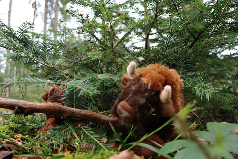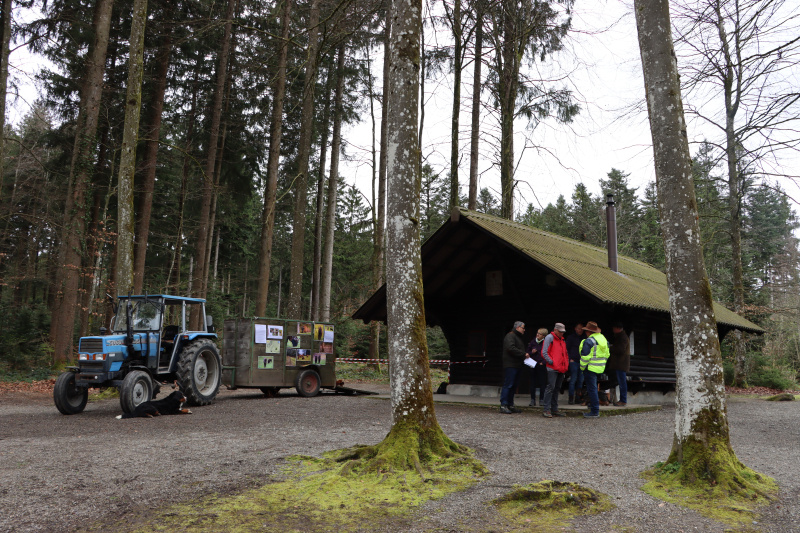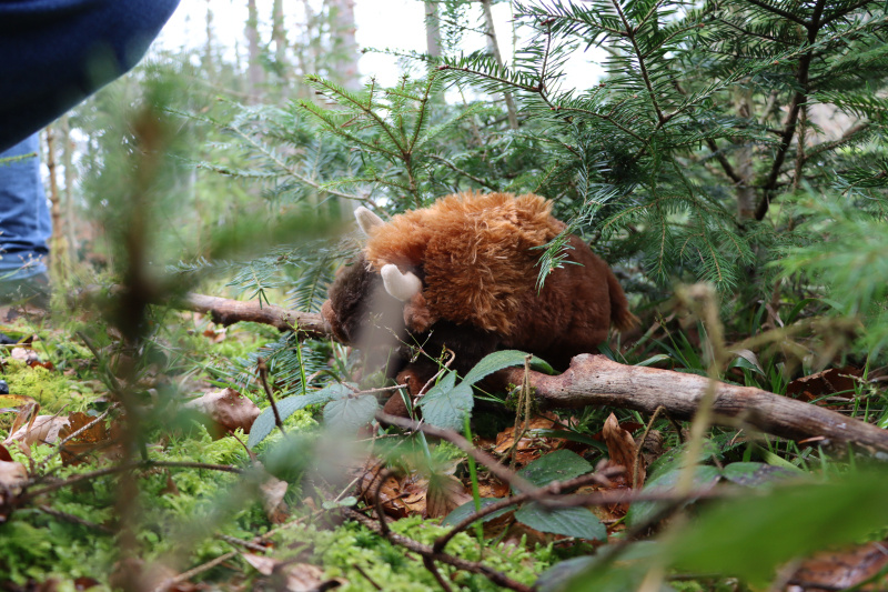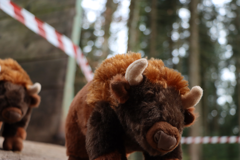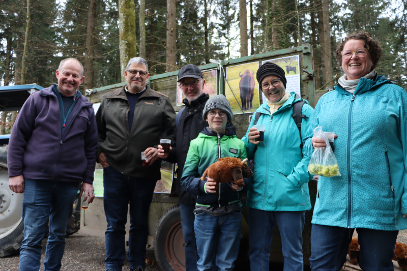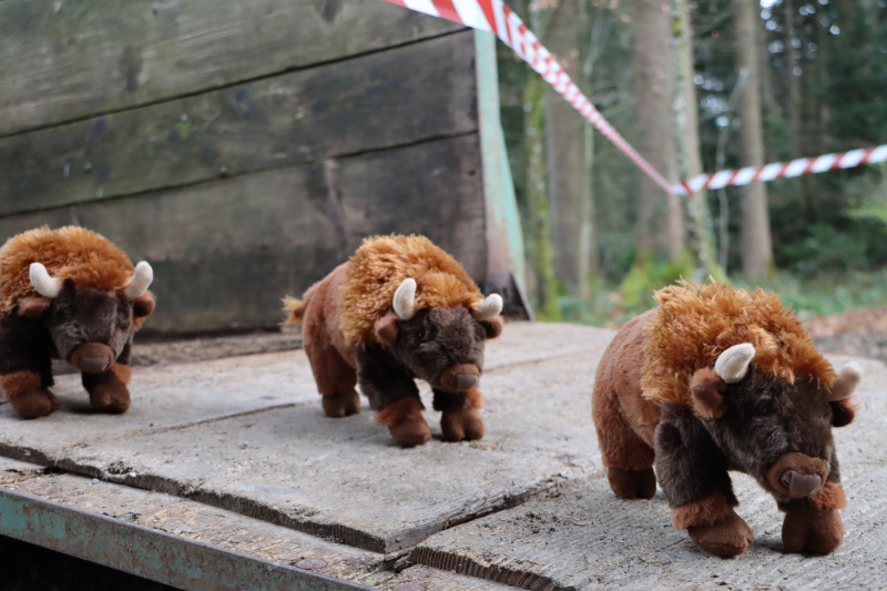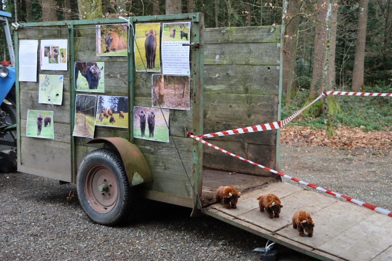 Nun, grosse Menschenmassen zog der ausführliche Vorbericht im «Michelsämter» nicht an, als angeboten wurde, man dürfe am Ostermontag um 10 Uhr zuschauen, wenn die Tiere bei der Korporationshütte im Chegelwald der wilden Natur übergeben würden. Dennoch waren einige vor Ort, und wahrhaft – gelogen war da nichts. Alles war da, Infotafeln, überzeugte Referenten der Vernetzung Michelsamt und auf dem Transporter drei Wisente – allerdings aus Plüsch.