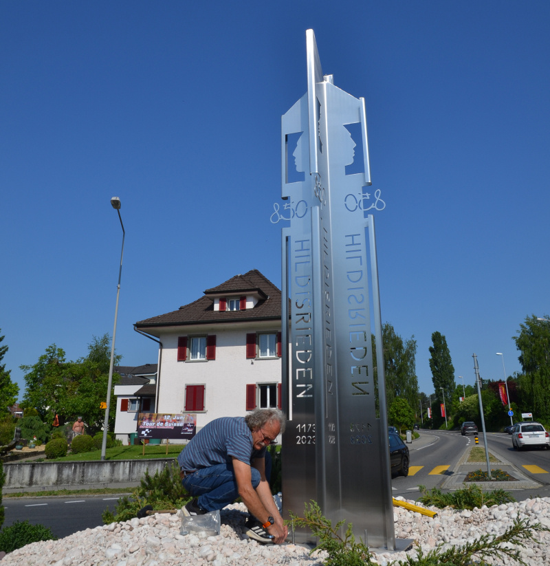 Seit Frühjahr 2022 stand der Dorfkreisel leer da. Die aus dem Jahr 2005 stammende Installation des Initianten Otto Troxler und des beauftragten Architekten Toni Bühlmann hatte ausgedient. Eine Restauration lohnte sich nicht mehr. Das ästhetische Wasserspiel wurde aber vermisst. So bekam der ortsansässige Künstler Mark Walker den Auftrag des Gemeinderates und des «OK 850 Jahre Hildisrieden» im November 2022, sich etwas zu überlegen. Das hat er gerne gemacht. In Kreuzform sind nun vier Chromstahlplatten aufgestellt in Richtung der Strassen nach Hochdorf, Rothenburg, Sempach und Beromünster. Darin sind oben Gesichter im Profil eingefräst, die in die vier Hauptrichtungen blicken. Der seit 35 Jahren in Hildisrieden wohnhafte Künstler hat schon im Jahr 2006 auf dem Begegnungsplatz bei Bank, Post und Gemeindeverwaltung eine gleich gearbeitete Stahlstele mit eingelassenen Gesichtern errichten dürfen zum sehr sinnigen Thema «Begegnungen». Sie stellt mit den Kopfprofilen ein Kommen und Gehen, ein Treffen und Auseinandergehen dar. Die Skulptur zeigt den Menschen der unterwegs ist, unterwegs in seinem Lebenslauf, im Erfüllen seiner Lebensaufgaben. Das neue Kunstwerk ist eine Fortsetzung, eine Ergänzung dieses Themas. Mark Walker sagt: «In Hildisrieden kreuzen sich die Nord-Süd- und die Ost-West-Strassenverbindung. Hier ist der Ausgangspunkt jedes Weggehens aus Hildisrieden an andere Orte. Das Denkmal auf diesem Punkt ist eine Hommage an die Menschen, die in Hildisrieden leben und in den letzten 850 Jahren gelebt haben und hier noch leben werden. Es appelliert an die Passant:innen, andere Kulturen, andere Denkweisen in Nah und Fern zu respektieren, denn Respekt ist der Schlüssel zu Kommunikation und damit zum Frieden.»