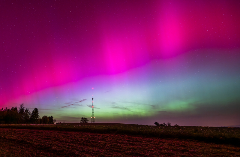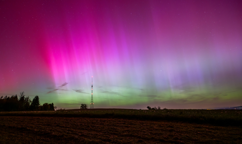 Das sensationellste Bild schickte Reto Büchi aus Gunzwil. «Dass die Chance, Nordlichter zu sehen, auch bei uns gross ist, wusste ich aufgrund der Aurora App auf meinem Smartphone», erzählt er. Mit einer Nikon Z7 II, und einem Sigma 14mm 1:1.8 DG Objektiv ausgerüstet, verbrachte er etwa drei Stunden auf dem Blosenberg, rückte den Landessender und Licht perfekt ins Bild. «Es war schlichtweg sensationell, dass man die Nordlichter nicht nur mit der Kamera, sondern die Farben am Himmel von blossem Auge erkennen konnte. Das ist für unsere Breitengrade sicher sehr selten!»