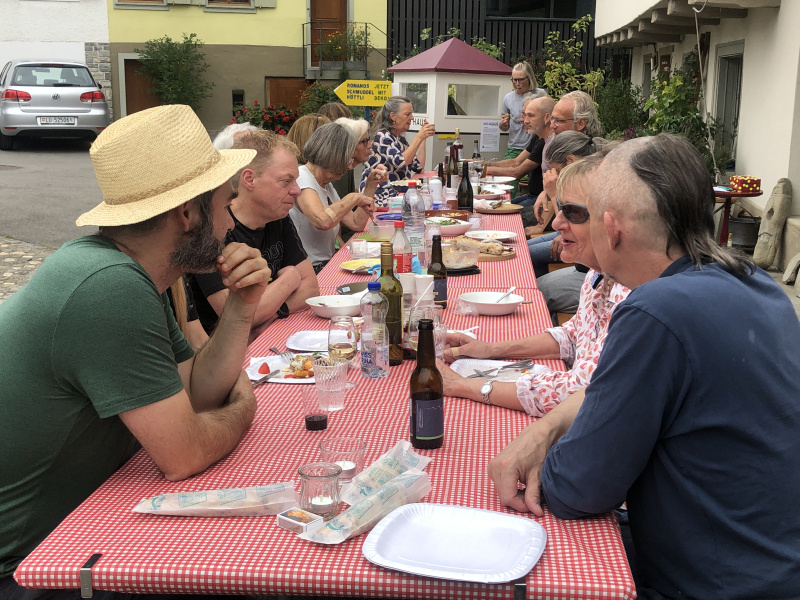 Bei perfektem Sommerwetter fand am Sonntag, 14. August, beim Ryn-Brunnen in Beromünster die erste öffentliche Tavolata statt. Rund zwanzig Tafelfreudige nahmen am langen, hübsch gedeckten Tisch Platz und genossen gemeinsam die je selbst mitgebrachten Speisen. Vom zarten Zucchinikuchen über diverse Salate mit allem, was die Gärten zurzeit hergeben, bis zu feinen Polentaplätzchen und vom herzhaften Knoblauchbrot bis zu nordafrikanischen Hackbällchen mit Quark-Dip – es gab einiges zu schmecken, zu probieren und zu schlemmen. Dazu gabs frisches Quellwasser aus dem Ryn-Brunnen, hiesiges Bier und das eine oder andere Glas Wein. In fröhlicher Runde neue Leute kennenlernen oder mit Altbekannten zusammensitzen und bei guten Gesprächen den Sommer geniessen: Die erste Tavolata des Vereins Kulturfläck Beromünster war ein Erfolg, Fortsetzung im nächsten Sommer folgt.