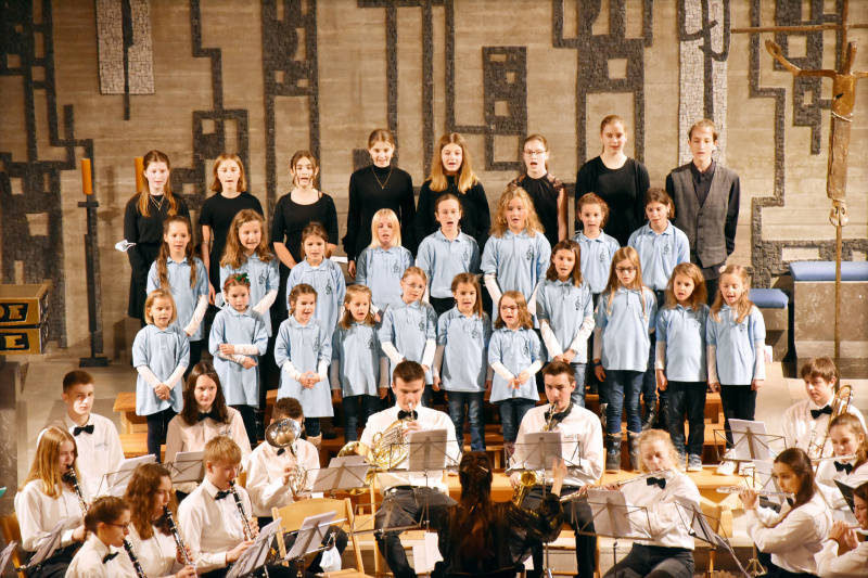 Nachdem das Blechbläserensemble Fortepiano die Bühne rund um den Altar räumte, übernahmen die Musikant:innen der Little Brassers. Diese unterschieden sich nicht nur optisch von ihrer Vorgruppe, sondern auch musikalisch. In weissen Hemden oder Blusen kombiniert mit orangen Ensemblekrawatten und -foulards führte die Jugendformation ebenfalls drei Musikstücke auf. Nebst den traditionellen Weihnachtsklassikern «Little Drummer Boy» und «Jingle Bells» entführten sie das Publikum auch in die weite Abenteuerwelt der Hollywood-Filme. Überzeugend präsentierten die Jugendlichen unter der musikalischen Leitung von David Rufer das Filmmusik-Medley, welches bekannte Melodien aus «Star Wars», «Jurassic Park» und «E.T. – Der Ausserirdische» enthielt. Die Little Brassers reihen sich auf der dreistufigen Brassensembleskala der Musikschule Michelsamt in der Mittelstufe ein. Zuvor erlernten die meisten Musizierenden das gemeinsame Vortragen im vorgängig aufgetretenen Blechbläserensemble Fortepiano, das auf der Elementarstufe anzusiedeln ist. Nachdem bei den Little Brassers weitere musikalische Erfahrungen gesammelt wurden, können die Jugendlichen mit entsprechenden Fähigkeiten zur Jugend Brass Band Michelsamt in die Oberstufe aufsteigen.