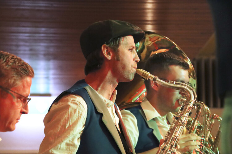 Konzentriert am Werk: Wynebläch.Start mit «Wynebläch»Den Einstieg in den Abend setzte «Wynebläch», eine achtköpfige Kleinformation aus dem – wie der Name sagt – Wynental. Die Musikanten konnten mit absoluten Brass-Klassikern von Marsch, Polka bis zu Udo Jürgens «Aber bitte mit Sahne» unterhalten. Und nicht nur Udo Jürgens durfte nach Sahne bitten: So wurde das Publikum mit Crèmeschnitten, Kaffee und anderen Leckereien exzellent bedient. Und auch auf der Bühne konnte zwischen den Stücken herzlichst angestossen…