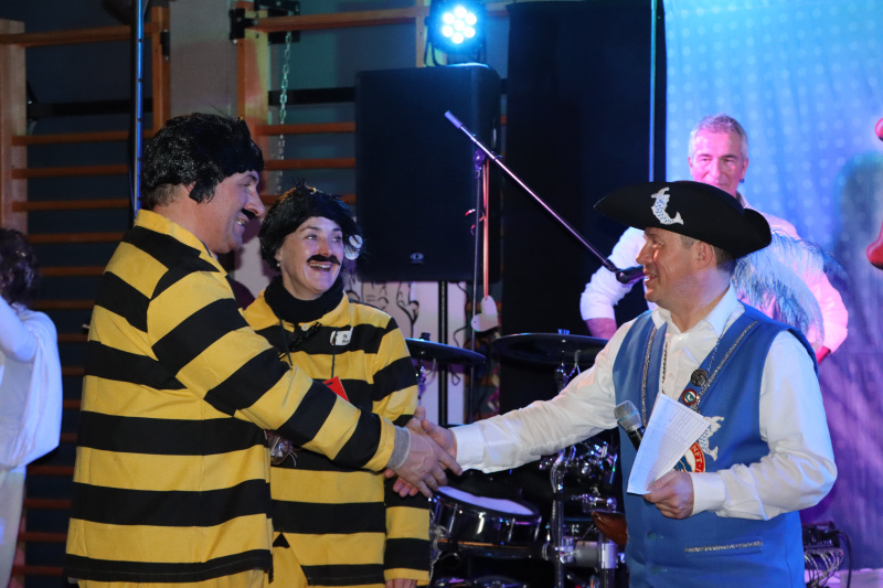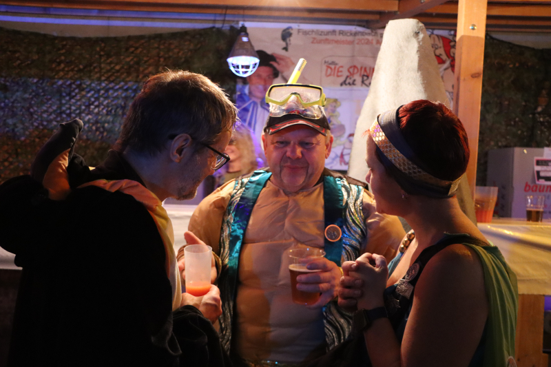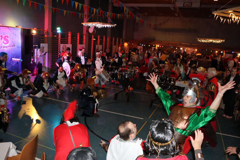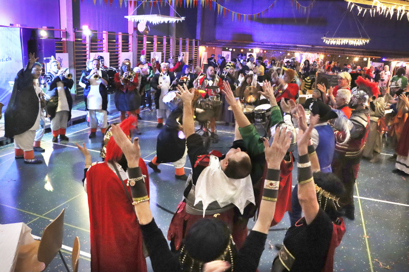 Die erprobten «Zuzweit-Unterhalter» The Ringo’s gaben durchgehend den Takt des Abends vor. Die Tanzfläche, die immerhin fast einen Viertel der Halle ausmachte, blieb nie leer. Im Paartanz wurden Tanzbeine und alles was sich bewegen liess, fröhlich geschwungen. Zu Schlagern wurde gejohlt und natürlich fehlten all die Reisser nicht, die die Leute vom Hocker holten und in eine langgezogene Polonaise lockten. «Und dann die Hände, zum Himmel... wir wollen fröhlich sein...» Ja, das waren sie, die Leute von der Fischlizunft und ihre Gäste. Auch die Zünfte von Neudorf und Hildisrieden machten ihre Aufwartung und musikalischen Besuch gabs von den Stössucheibe, den Schnäggeschränzern und zu Mitternacht von der Guuggemusig Auckland, welche mit Rickenbach eine jahrelange Freundschaft verbindet, und die all Schaltjahr mal wieder hier auftauchen. Es war ein Riesenfest.