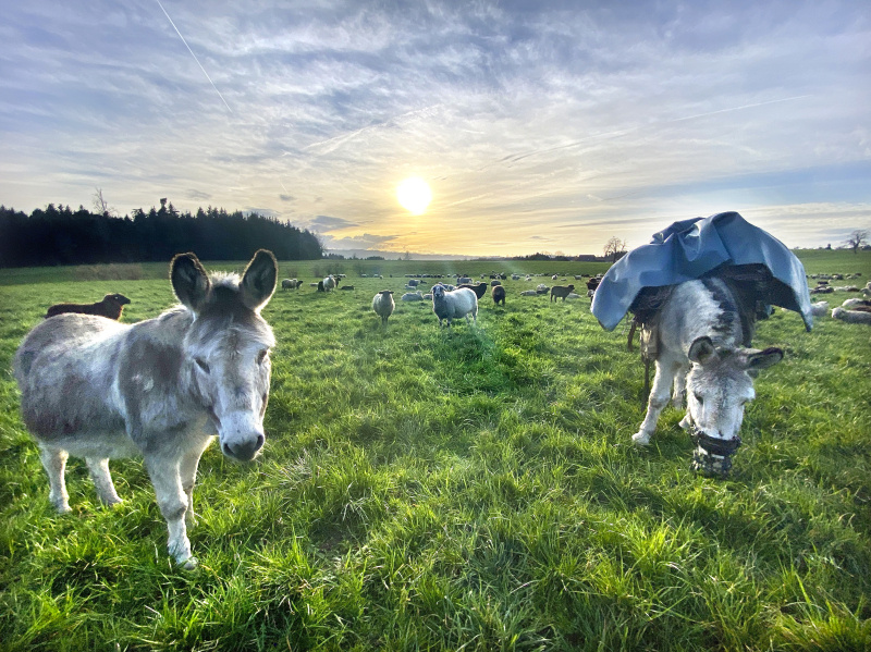 Da sah ich unterhalb von Hildisrieden die Schafherde, die mich schon mehrmals zu einem Halt und einem Schwatz animiert hat. Ich hatte zehn Minuten Zeit für einige Gegenlichtaufnahmen der fast biblischen Szenerie und ein Gespräch mit dem Wanderhirten Michael Cadenazzi, der bis Mitte März durchs Michelsamt zieht. Die Schafe waren jedoch für ein Interview nicht zu haben. Mehr als ein «Määääääh» war ihnen nicht zu entlocken. Auch die prächtigen Esel waren äusserst wortkarg. So nahm ich am Folgetag nochmals mit dem Wanderhirten Kontakt auf und recherchierte über die Tiere und das Wanderhirtentum.