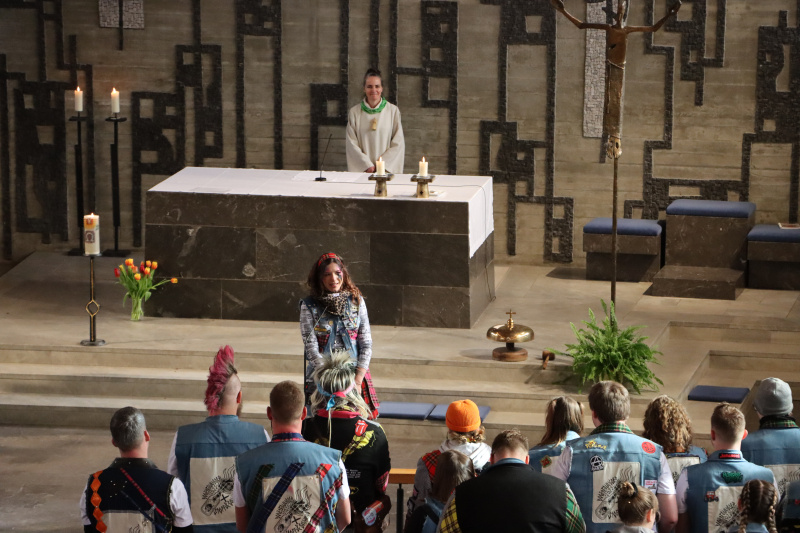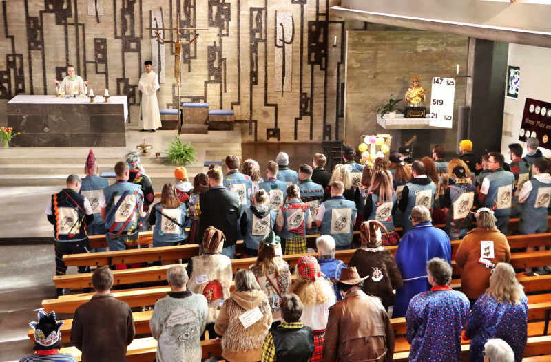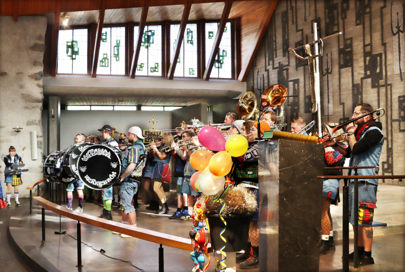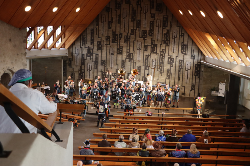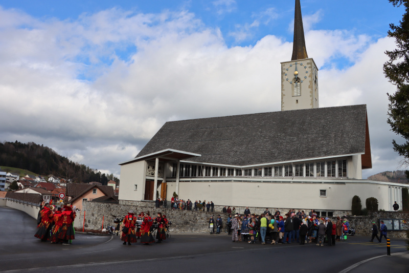 Die Herausforderung dieses Auftritts bestand für sie darin, sich ausnahmsweise in Sachen Lautstärke zurückzunehmen. Was auch gelang. Nichtsdestotrotz klangen ihre drei Stücke sehr imposant und voluminös – ein wahres Erlebnis. «Die Lebensfreude Gottes sei mit euch», begrüsste Pastoralraumleiterin Theres Küng die Gemeinde mit ausgebreiteten Armen. Die Bogeteguugger in ihren teils zerfetzten Punk-Kostümen sassen in den vordersten Bänken und die Messbesucher in den hintersten, die Fischlizünftler in der Mitte. Für die aktiven Fasnächtler:innen war es ein eher früh angesetzter Termin, aber alles klappte reibungslos. Katholische Messfeier und Fasnachtsmusik unter einem Dach – wer hätte sich das jemals denken können. Nun, die Zeiten ändern sich. Was bleibt, ist die unbändige Lebensfreude.