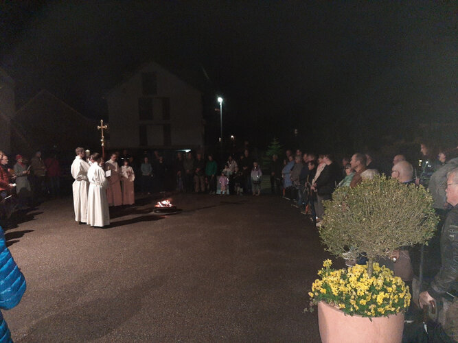 Warm brannte auf dem Kirchenvorplatz in Rickenbach das Osterfeuer, als die Gläubigen kamen und sich in sicherem Abstand rund um das Feuer scharten.