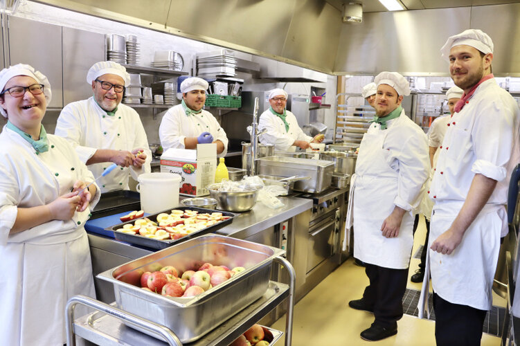 Fritz Suter in der Textilabteilung kommt gar nicht so recht zum Sticken vor lauter herzlicher Begrüssung.Eine neue Erfahrung Erwin Studer und Hanspeter Berger wurden gleich mit Hut und Küchenschurz eingekleidet und ins Küchenteam befördert. Da gings ruck zuck…