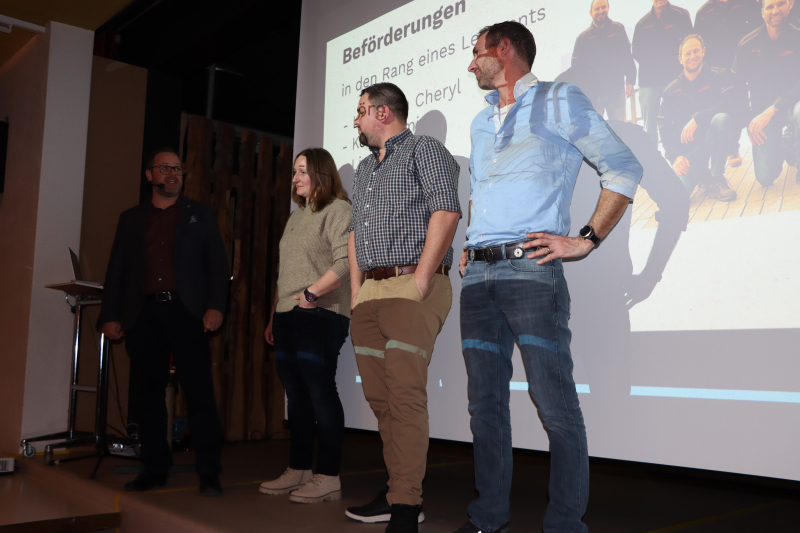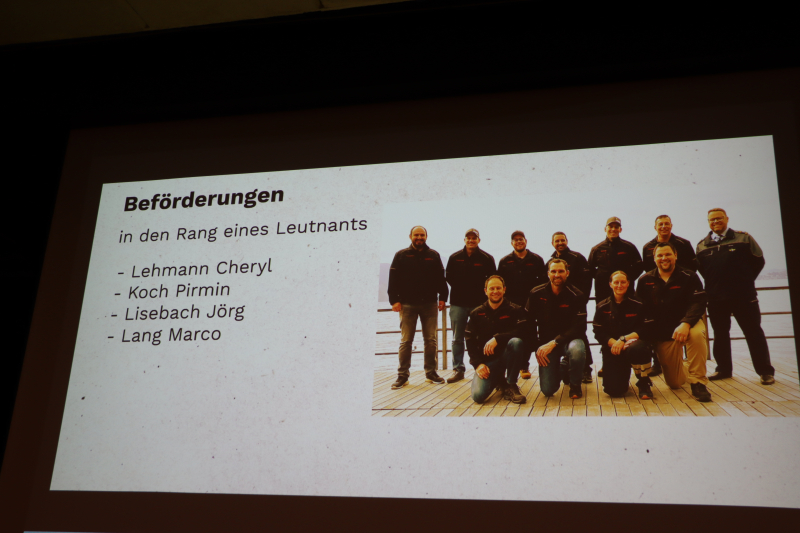 «Heuer machen wir den Jahresrückblick etwas anders», verkündete Kommandant Armin Dörig. Statt bloss Folien ab Power Point zu präsentieren, wolle man die Leute im Saal gleich selber zu Wort kommen lassen. Wobei Vize-Kommandant Thomas Bussmann verstecktes Showmaster-Talent offenbarte. Mit dem Mikrofon ging er von Tisch zu Tisch und befragte diese und jenen zu verschiedenen Aktivitäten des vergangenen Jahres – erfrischend anders. «Wie verlief der Einsatz?» - «Sehr gut, aber die Verpflegung hat gefehlt.» Grosses Gelächter im Saal. Oder: «Wie hat es dir gefallen am Gruppenführerkurs?» - «Die Verpflegung war sehr gut!» Immer wieder kam etwa auch die ominöse Übung «Verkehrte Welt» zur Sprache. Unter der Leitung von Ausbildungschef Reto Stoll hatten die Eingeteilten letztes Jahr an einer Übung ihre Jobs und Aufgaben getauscht – kein leichtes Unterfangen. Vor allem wurde dadurch das Verständnis geförderte und aufgezeigt, wie wichtig die spezifische Ausbildung in jeder Abteilung ist.