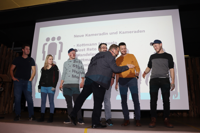 Nun das Personelle: Austritte, Ehrungen und Beförderungen, neu Eingeteilte. (Man muss sich dabei der Versuchung erwehren, von «Neumitgliedern» zu sprechen. Die Feuerwehr ist kein Verein, sondern eine Institution, zählt also keine Mitglieder, sondern Eingeteilte, Kameradinnen und Kameraden.) Doch zuerst zu den Austritten: Neun Personen legten den – teils hoch dekorierten – Hut nun an den Nagel. Zehn Personen wurden zu Ehrungen und Beförderungen zur Bühne gebeten und als Neue wurden eine Kameradin und sieben Kameraden unter Applaus begrüsst. (Namen siehe Box) «Wir sind in der glücklichen Lage, dass junge Leute von selbst kommen!», so Dörig.