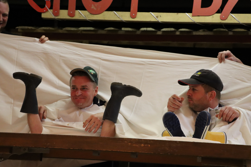 Das vorgeführte Spiel war so einfach wie effektvoll, man kennt es von jedem zweiten Skilager und doch bringt es alle immer wieder zum Tränenlachen: Das mit den Köpfen, dem Tisch, dem Leintuch und den Gummistiefelchen. Zum Grölen – Portmann und Marbach gaben sich die Ehre. Dann ein nicht minder die Lachmuskeln strapazierendes Frage-und-Antwort-Spiel, wo zwei Kandidaten per Tafel rücklings sitzend dieselben Fragen beantworten. Ich? Du? Wer? Portmann und Dörig demonstrierten perfekte Übereinstimmung ihrer Zusammenarbeit bei Fragen wie «Wer hat die besseren Proben organisiert?» Oder: «Wer ging nach der Übung früher nachhause?» Ich! Du! Wer? Gute Kameradschaft drückt sich auch in gutem Humor aus.