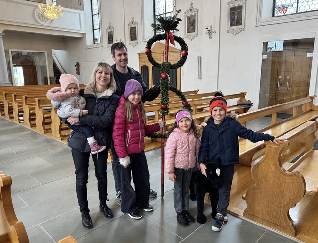 Die Karwoche wurde durch den eindrücklich gestalteten Familiengottesdienst am Palmsonntag eröffnet. Pfarreileiter Erich Hausheer durfte die in ausdauernder Handarbeit von den Ministrantinnen und Ministranten und dem Sakristaninnenteam gefertigte fünf Meter hohe Stangenpalme sowie auch die wunderschöne Familienpalme segnen.