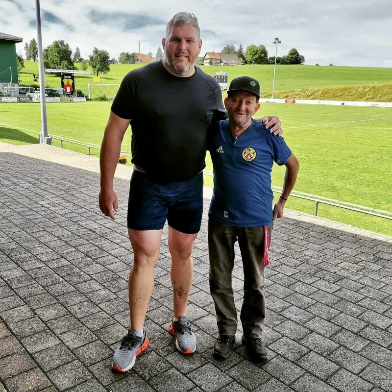 Eine spezielle Aufnahme ist letzten Montag entstanden: Vereinslegende Beat «Katic» Winiger und sein Idol «Herr Stucki». Katic hilft im Clubhaus am Montagmorgen jeweils beim Räumen/Putzen. Chrigu Stucki trainiert jeweils bei Herzog und benutzt die Duschen des FC Gunzwil. So kam es zu diesem «ungleichen» Treffen. Chrigu Stucki bringt ungefähr 140 Kilogramm auf die Waage...