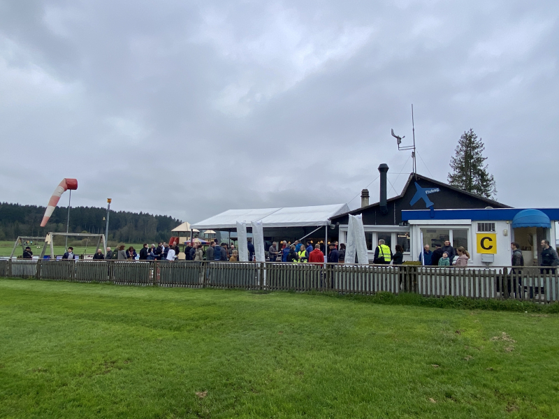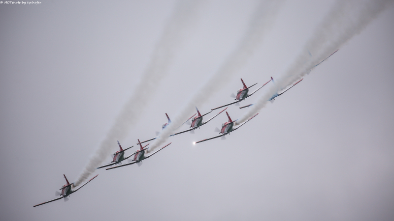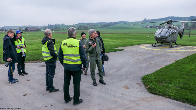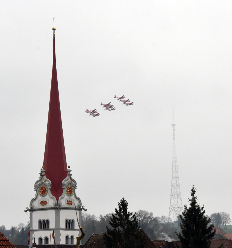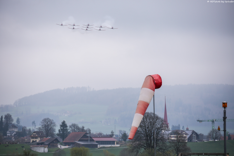 Präsident Dominik Simmen, Leiter der Airport Helikopter AG, richtete das Wort an die Anwesenden. Aus wettertechnischen Gründen war nur der Überflug von einigen Minuten Dauer möglich und nicht das gesamte geplante Programm, das 20 Minuten gedauert hätte. Man hätte den PC-7-Fliegern gerne länger zugesehen, doch dafür wär bessere Sicht, etwa auf den Sendeturm, erforderlich gewesen, weshalb man davon absehen musste. Die zahlreichen Fotografen hatten schnell zu sein, wollten sie gute Fotos vom Überflug der neun PC-7 schiessen.