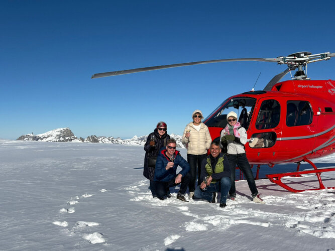 Hoch hinaus gings am Dienstag für fünf Mitarbeitende der Wallimann Medien und Kommunikation AG. Sie alle wurden für eine stattliche Anzahl Arbeitsjahre gebührend verdankt. Dabei hoben sie ab – auf einem Heli-Gebirgsrundflug mit vergnüglicher Zwischenlandung auf 3077 Metern über Meer.