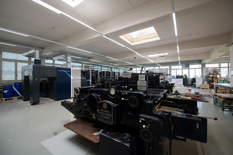 Hier wird die Druckgeschichte fortgeführt: Bei Wallimann steht eine 80-jährige Stanz- und Falzmaschine noch immer im Einsatz, doch auch eine der modernsten Druckmaschinen, die gegenwärtig erhältlich sind.