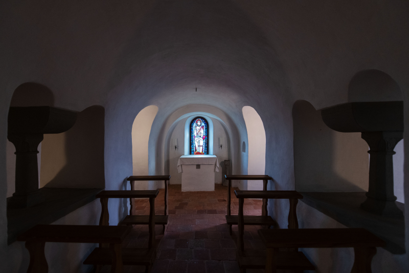 Die Krypta, unterirdische rein romanische Kapelle, mit fast 1000 Jahren der älteste Teil der Stiftskirche mit unterirdischem Grab von 14 Lenzburger Grafen. Ursprünglich war das Innere der ganzen Kirche schlicht und dunkel.