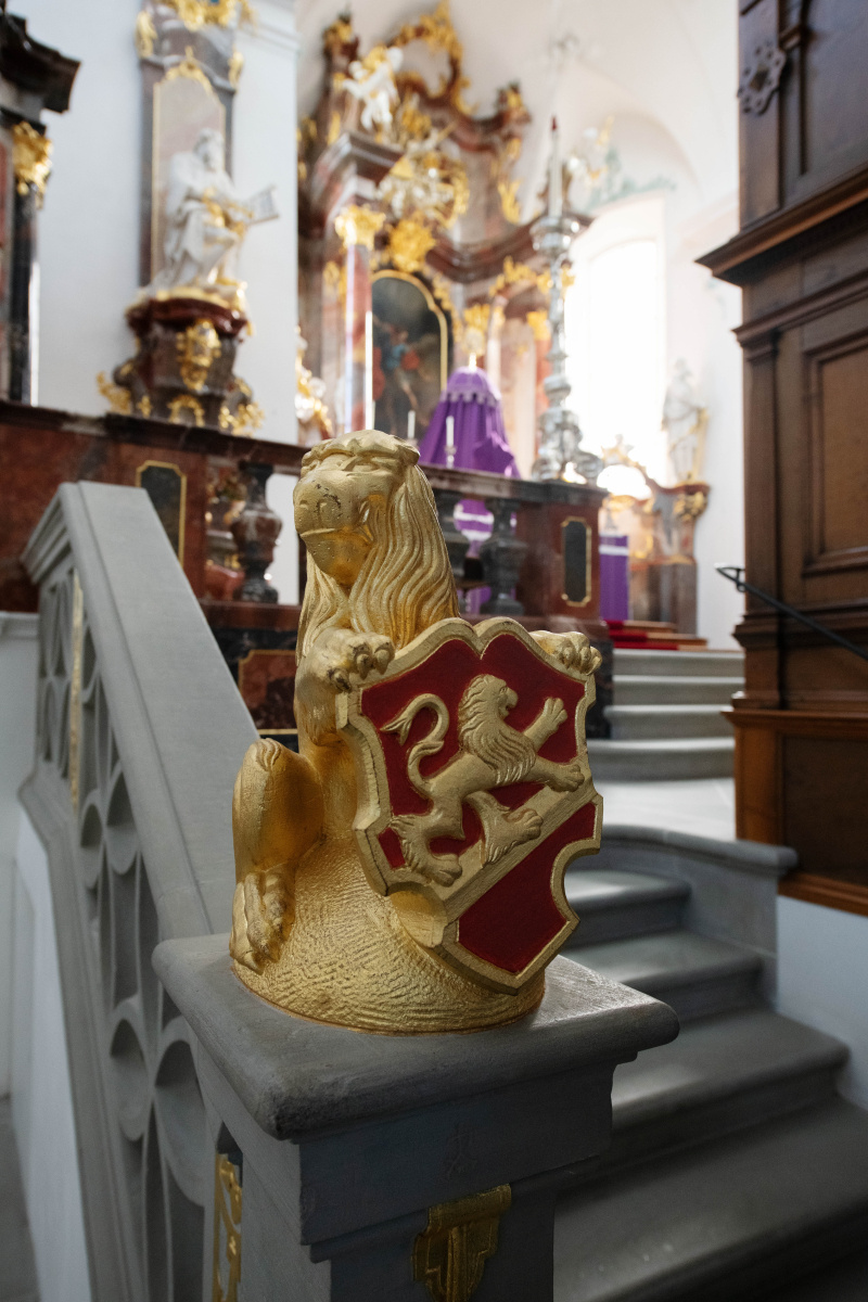 Der Löwe trägt ein prächtiges Wappen: Das Stiftswappen. Schild mit Schrägrechtsbalken und darüber schreitendem Löwen. Dies leitet sich vom Kyburgerwappen ab: zwei goldene Löwen auf ursprünglich schwarzem Grund, die dann die Farben der Habsburger, gold und rot, übernommen haben. Davon leitet sich wiederum das Wappen von Beromünster und Neudorf ab.Die Innenausstattung von hoher künstlerischer Qualität macht die Stiftskirche zu einem der schönsten Rokokobauwerke der Schweiz. Durch mehrere Umbauten im Laufe der Jahrhunderte und zwei Barockisierungen erhielt die Stiftskirche ihr heutiges Aussehen. Doch die frühromanische dreischiffige Basilika von 1034/36 blieb bis heute in den Grundzügen erhalten. Ursprünglich war das Innere der Kirche schlicht und dunkel.