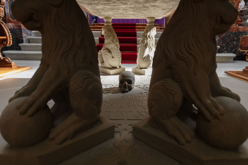 Tischgrabmal der Stifter. Fussplatte und Löwen von 1608, Platte von 1469. In den Ecken kauern die Löwen mit der Kugel, das Wappenzeichen der Stadt Lenzburg. In der Mitte ein Totenschädel.