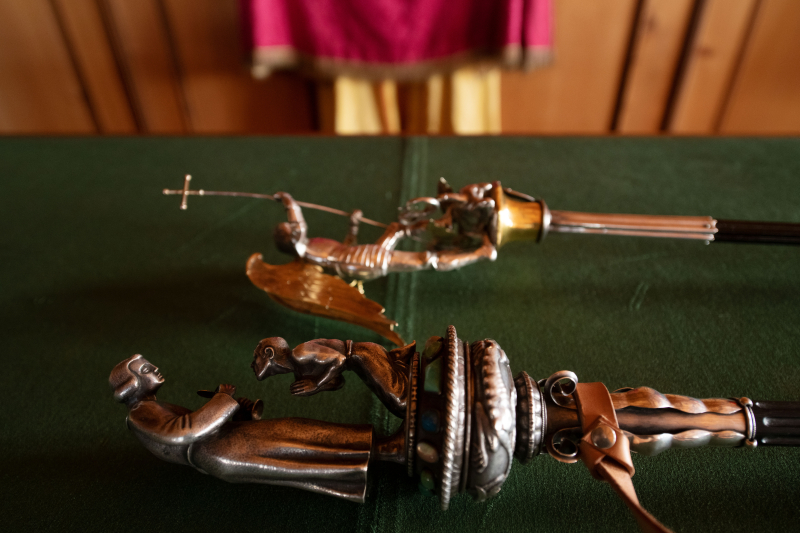 Bereit für die Prozession am Palmsonntag: der St. Michaelstab und der St. Stephansstab.
