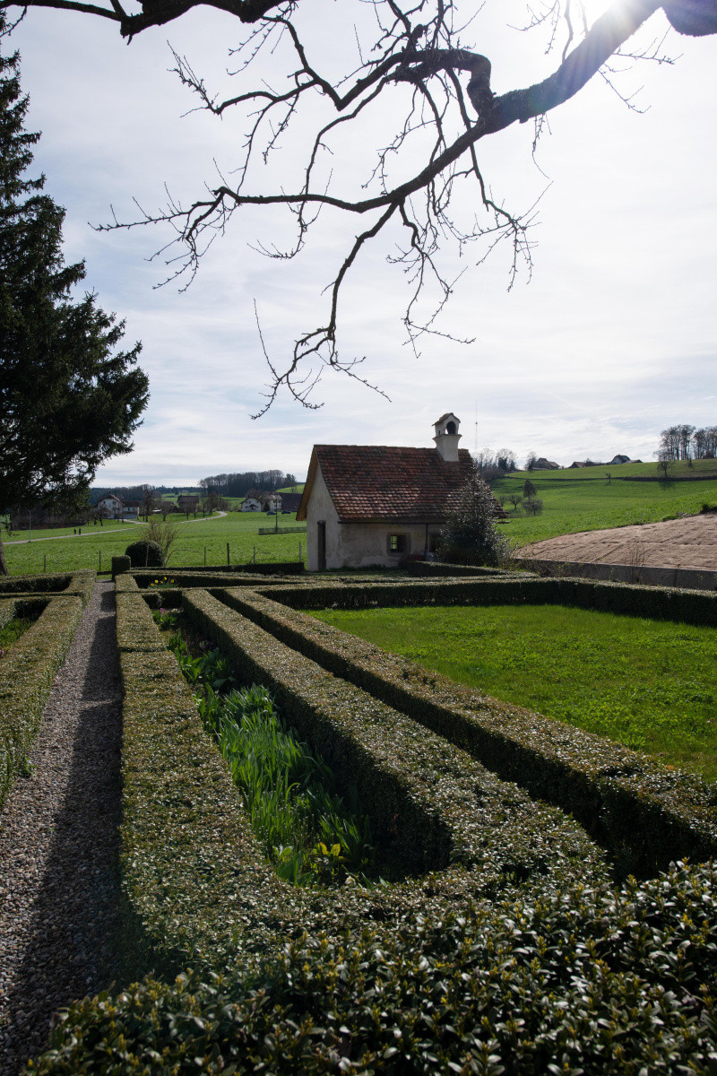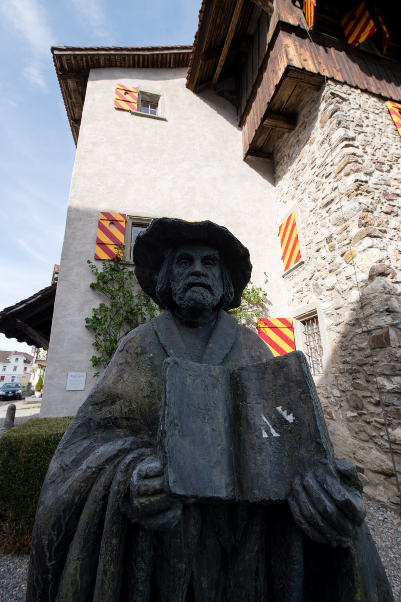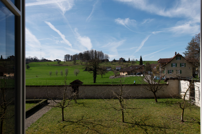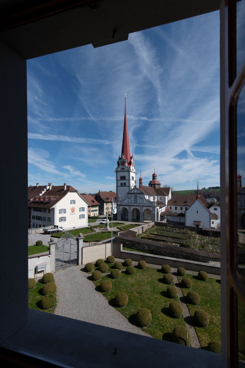 Blick aus dem Fenster der Stiftsbibliothek. Das Stift mit der auf einer kleinen Anhöhe stehenden Stiftskirche ist mehr als tausend Jahre alt und wurde von Graf Bero von Lenzburg gegründet. Nach alter Sage verlor dessen Sohn das Leben bei einem Kampf mit einem Bären. Der Graf liess daraufhin das Stift als Begräbnisstätte für seine Familie errichten.