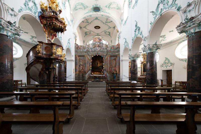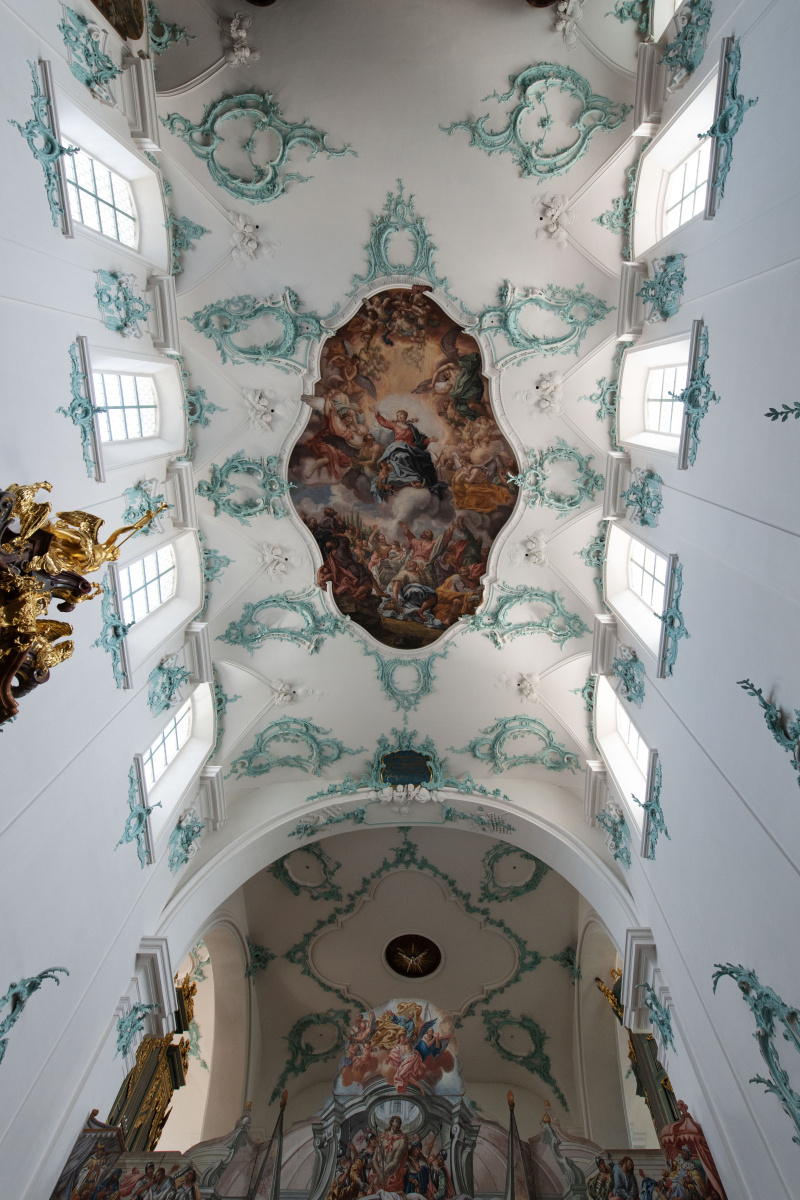 Mehr Rokoko geht fast nicht mehr: farbig und sinnenfreudig. Deckengemälde: Joseph Ignaz Weiss, 1774. Stukkaturen von Martin Fröwis.