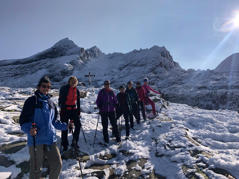Weiter gings (danach) nach Ried-Brig zur Talstation der Luftseilbahn Rosswald. Von da startete die ca. 3 ½-stündige Wanderung auf einer Etappe des Alpenpässeweges Richtung Simplonpass. Diese führte zuerst der Suone entlang, dann durch Mischwälder und Auen. Immer wieder gab der Weg die eindrückliche Sicht ins Rhonetal und auf die imposante Ganterbrücke frei. Ein paar schmale Felspartien waren zu überwinden. So erreichte die gut gelaunte Gruppe schliesslich das Tagesziel, die Bortelhütte auf 2113 m ü. M. Das Hüttenteam bereitete einen sehr herzlichen Empfang, sodass man sich sofort wie zu Hause fühlte. Später am Abend bewunderte man mit Kappe und Handschuhen ausgerüstet nochmals die verzuckerten Berge, den Sonnenuntergang und bald danach den aufgehenden Mond.